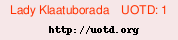 Name: Lady Klaatuborada Country: United States Team: The Knights Who Say Ni! |